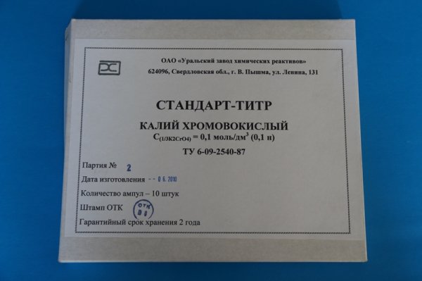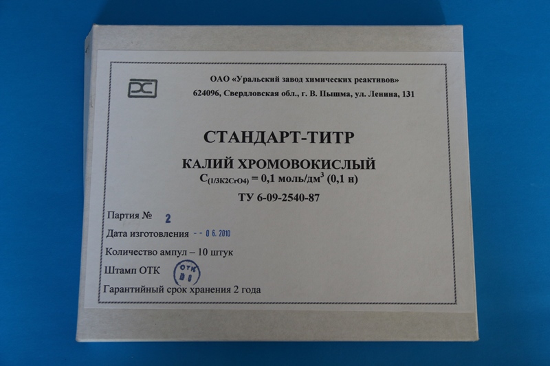 В ампулах калия хромовокислого содержатся некрупные желтоватые кристаллы ромбовидной формы. Стандарт-титры калия хромата используют для качественных анализов в аналитической химии и для рН-метрии.