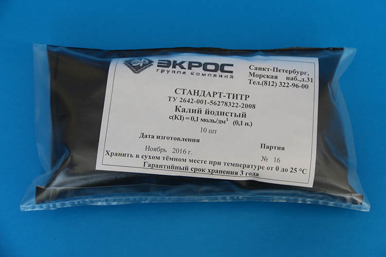 Фиксанал калий йодистый поставляется в ампулах. Квалификация реактива — «химически чистый» или «чистый для анализов». Белые кристаллы легко растворяются в воде, на свету меняют цвет на бурый. Точная навеска химического вещества в ампуле позволяет в лабораторных условиях приготовить стандартный раствор эквивалентный эталонному с известным объемом и концентрацией 0,100±0,001 моль/дм3.